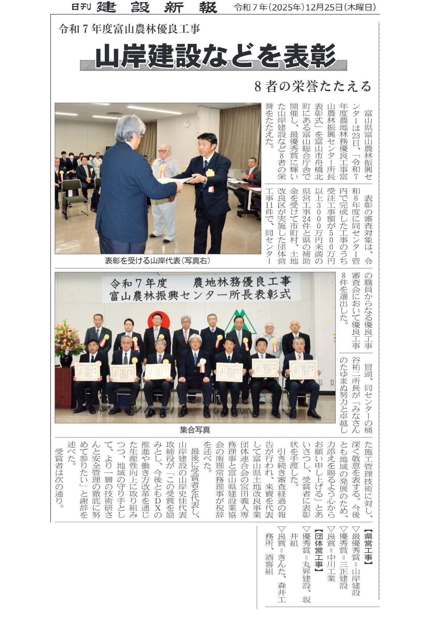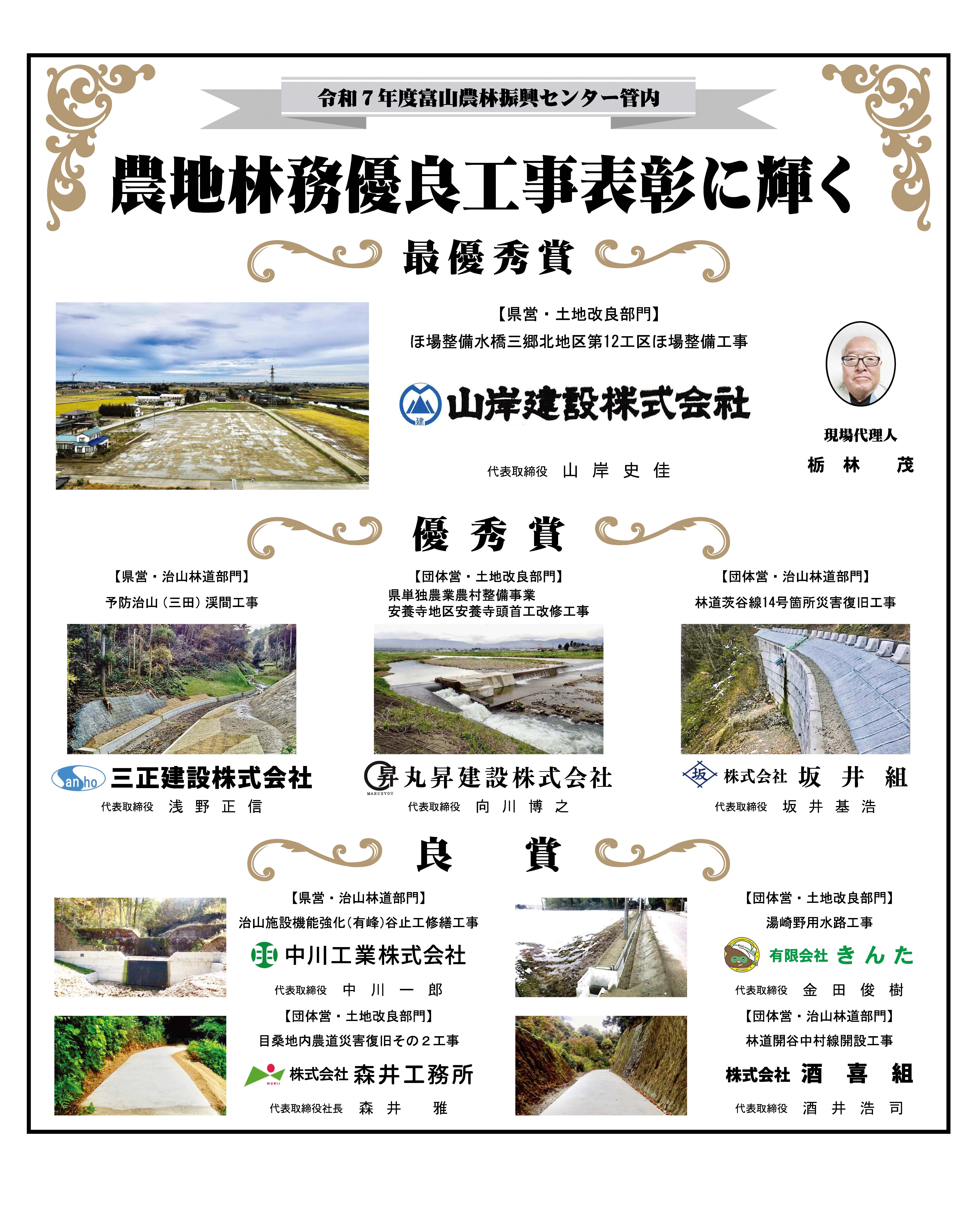 2025.12.25 富山農林振興センター 令和7年度優良工事表彰式で優秀賞を受賞いたしました 令和7年12月23日(火)に開催されました表彰式において、優秀賞を受賞いたしました。 富山県富山農林振興センター様からの補助金を受け、立山町様からの発注ならびに立山町農林課様に 監督いただいた立山町長倉地内の災害復旧工事に携わらせていただきました。 関係者の皆様に深く感謝いたします。今後ともご指導ご鞭撻のほどよろしくお願い申し上げます。